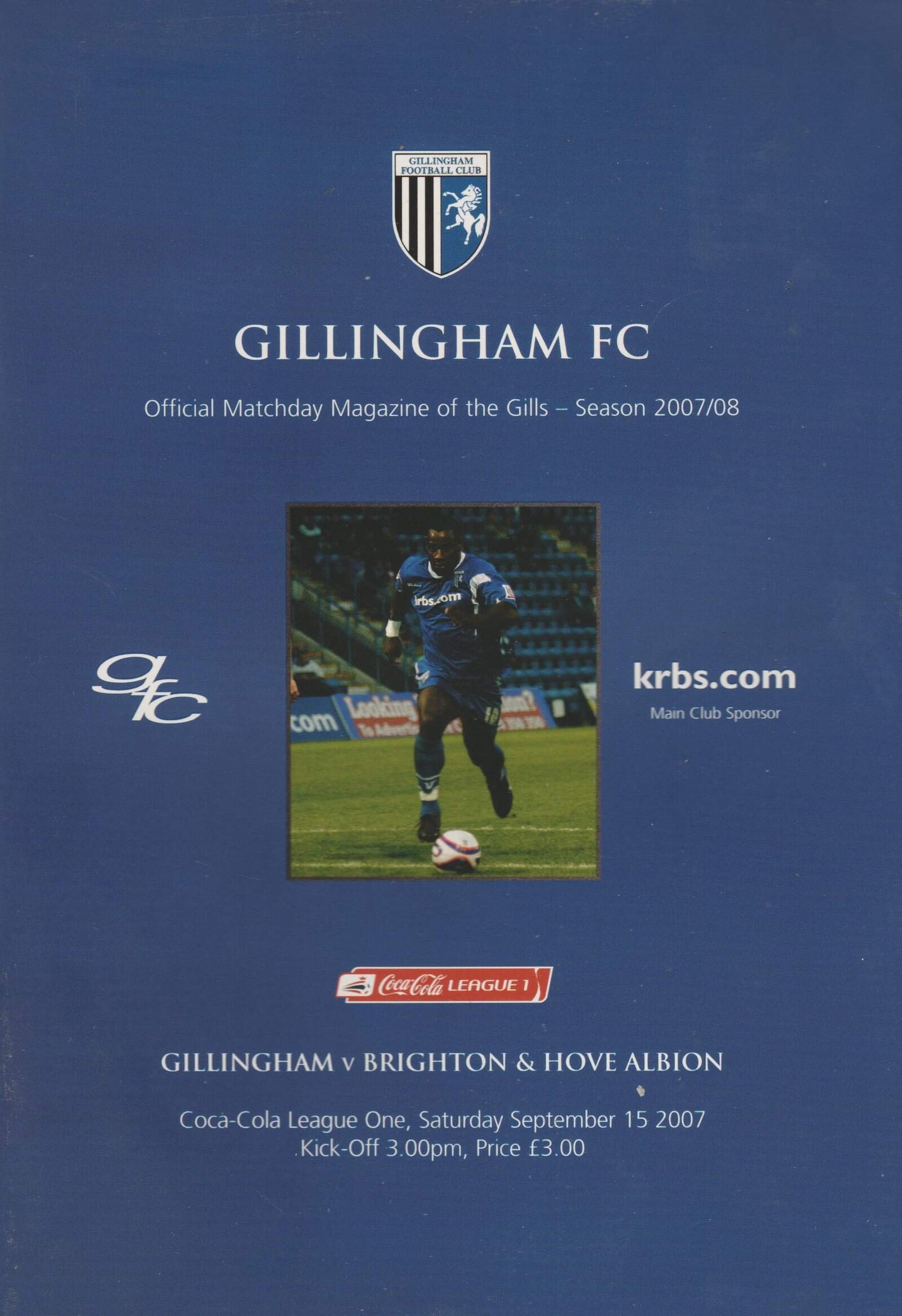 Match: Gillingham v Brighton and Hove Albion Competition: League 1 Date: 15-Sep-2007 Comments: Rating: 3 Condition: Scuff on edge of back page near spine Weight in grams: 200