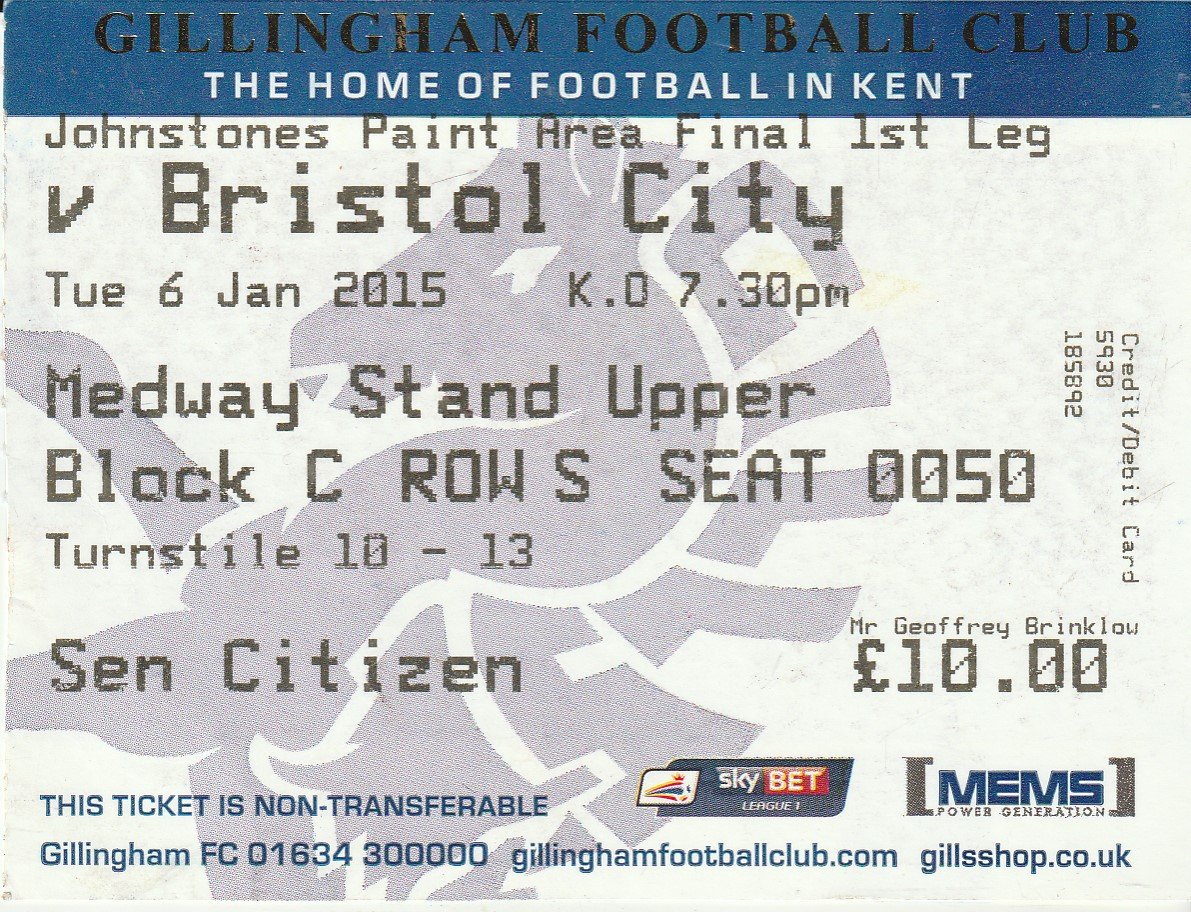 Match: Gillingham v Bristol City Competition: Johnstone Paints Trophy Area Final 1st leg Date: 06-Jan-2015 Comments: Rating: 4 Condition: Very good Weight in grams: 40