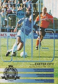 Match: Gillingham v Exeter City Competition: League Division 3 Date: 25-03-1995 Comments: Rating: 5 Condition: Excellent Weight in grams: 80