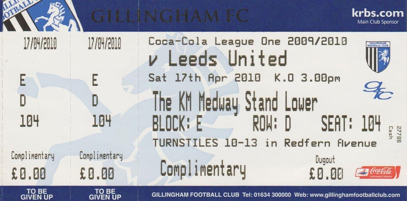 Match: Gillingham v Leeds United Competition: Coca Cola League 1 Date: 17-04-2010 Comments: Rating: 4 Condition: Very good Weight in grams: 10