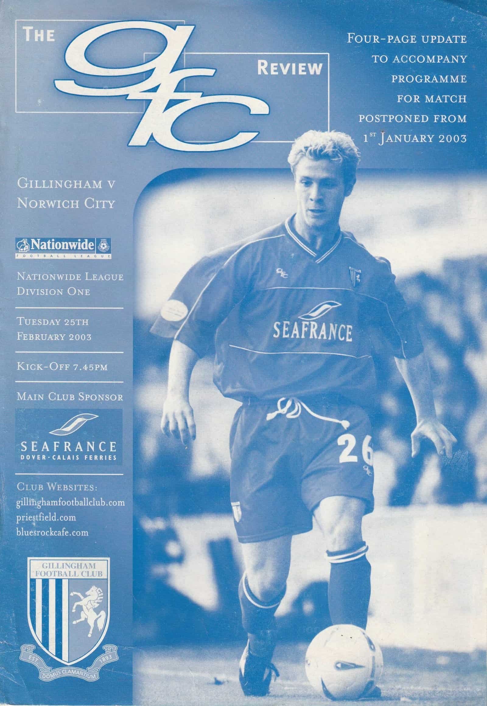 Match: Gillingham v Norwich City Competition: League Division 1 Date: 25-Feb-2003 Comments: 4 page issue, rearranged fixture Rating: 4 Condition: Good Weight in grams: 40