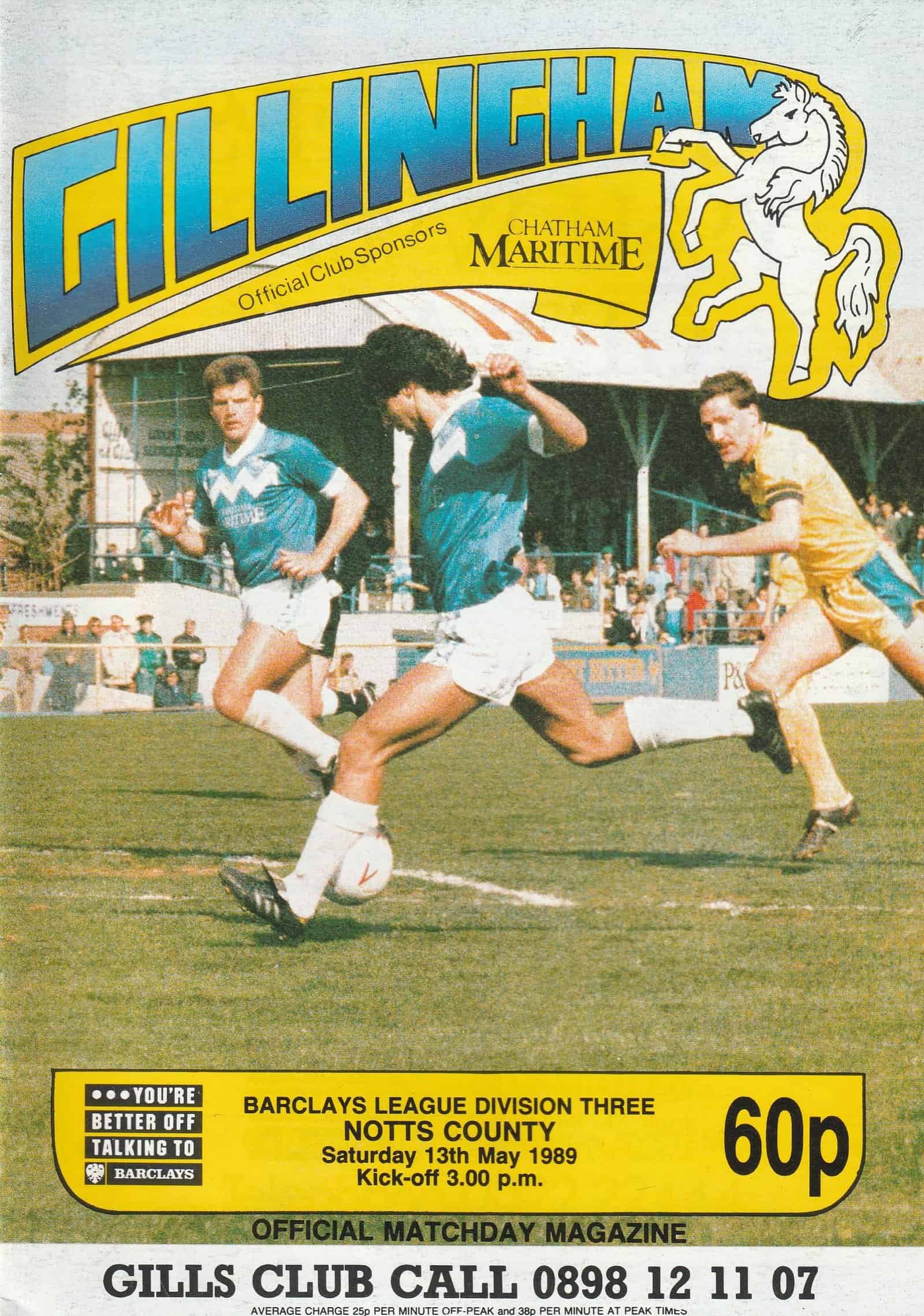 Match: Gillingham v Notts County Competition: League Division 3 Date: 13-May-1989 Comments: Rating: 4 Condition: Very good Weight in grams: 140