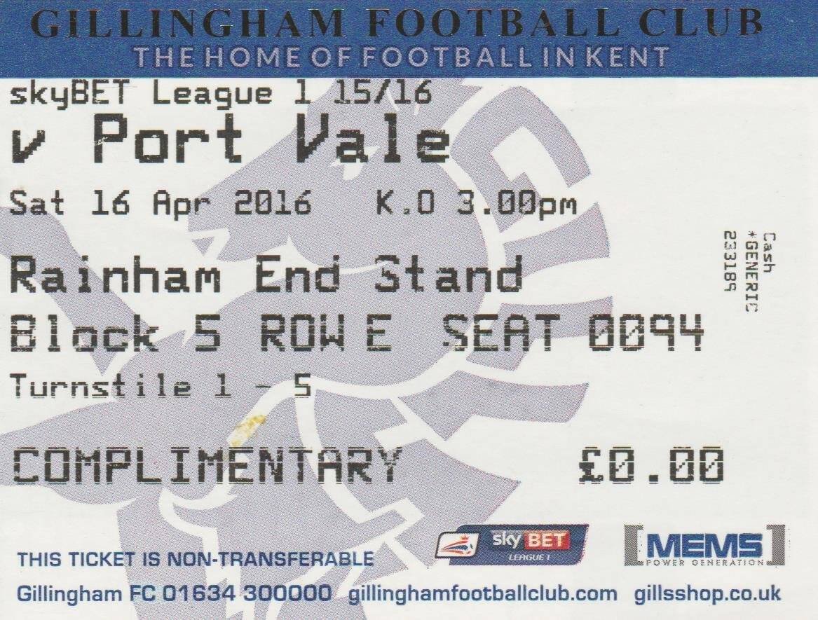 Match: Gillingham v Port Vale Competition: Sky Bet League 1 Date: 16-04-2016 Comments: Rating: 4 Condition: Very good Weight in grams: 10