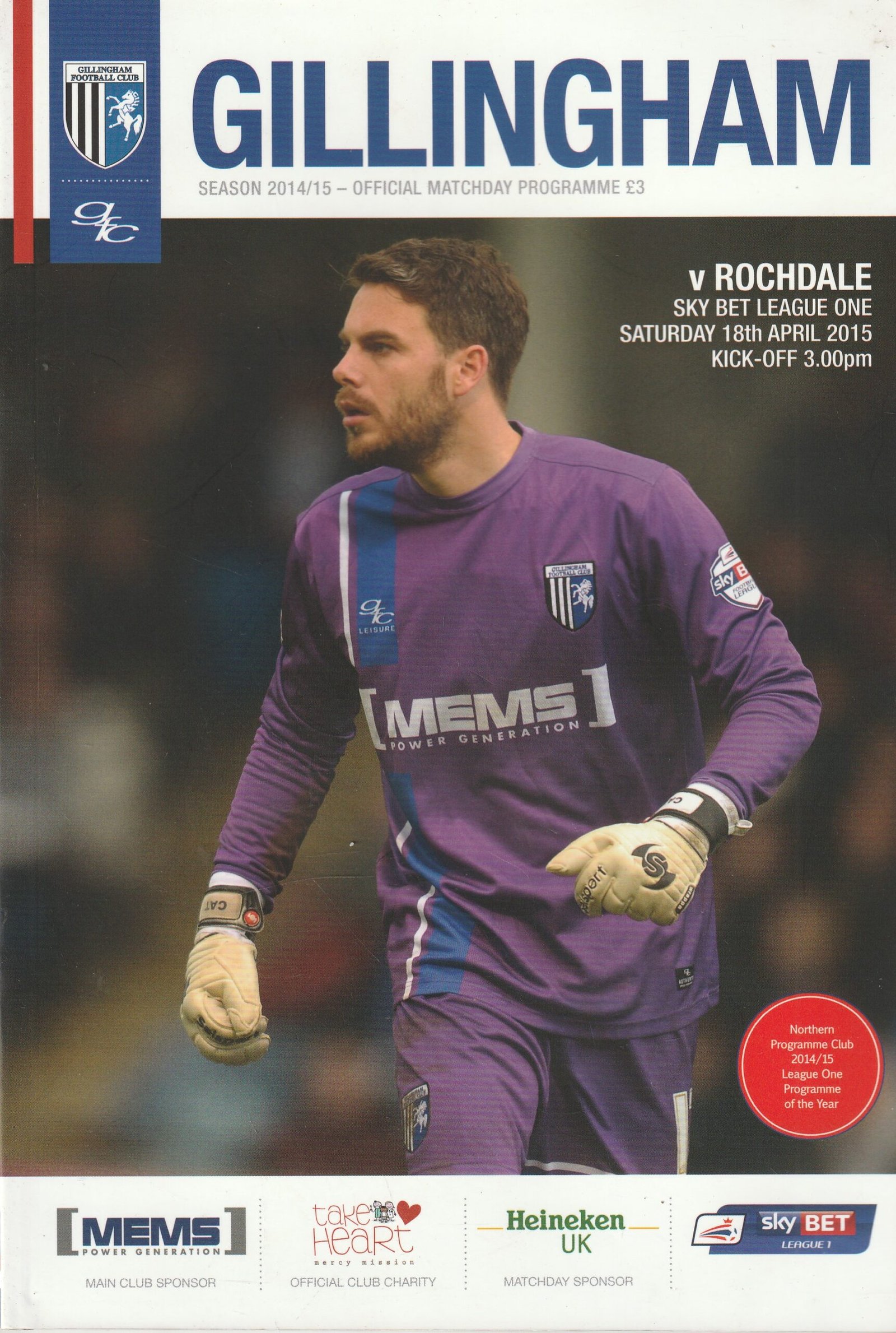 Match: Gillingham v Rochdale Competition: League 1 Date: 18-Apr-2015 Comments: Rating: 5 Condition: Excellent Weight in grams: 260