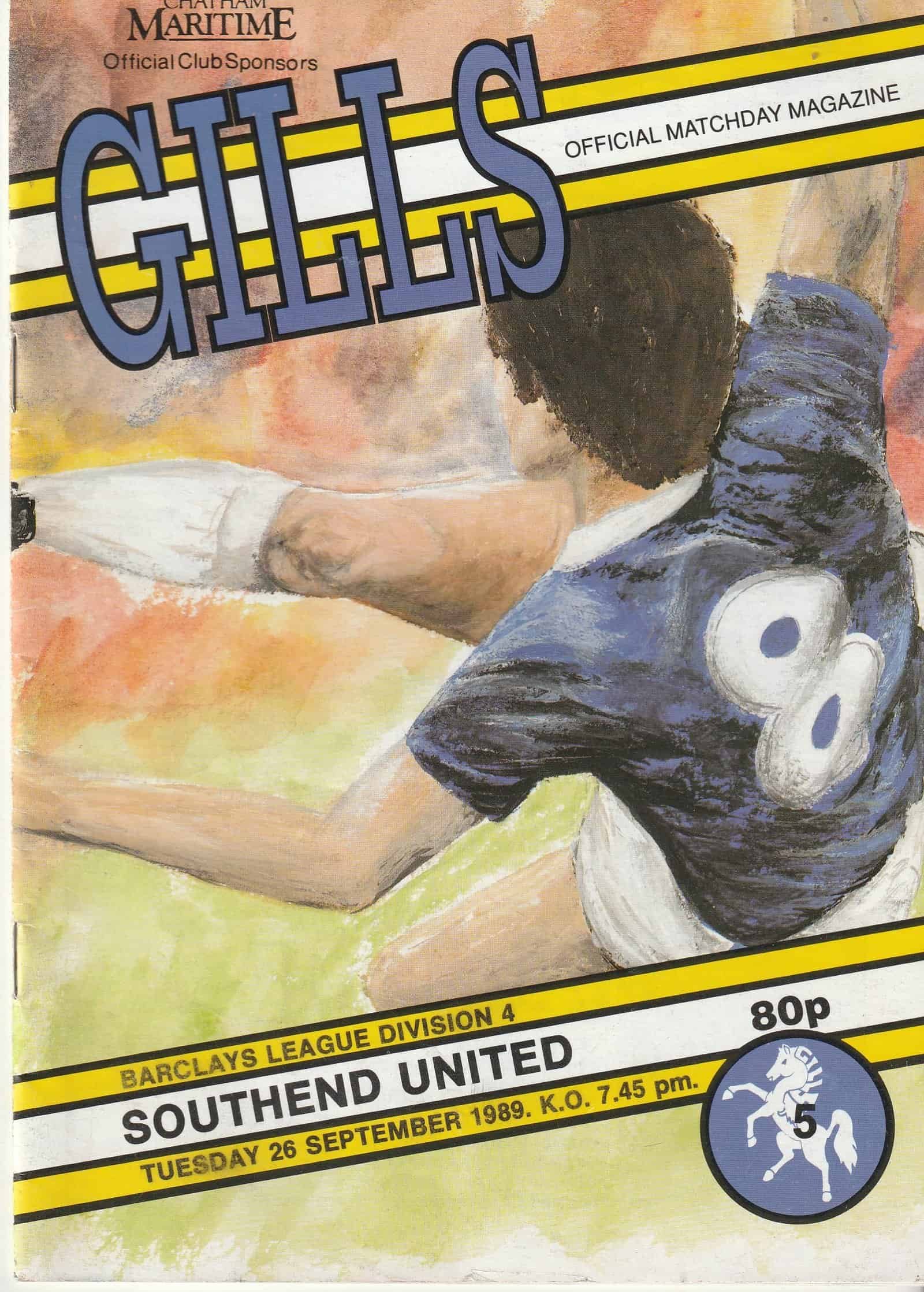 Match: Gillingham v Southend United Competition: League Division 4 Date: 26-09-1989 Comments: Rating: 3 Condition: Light soiling on back page Weight in grams: 100