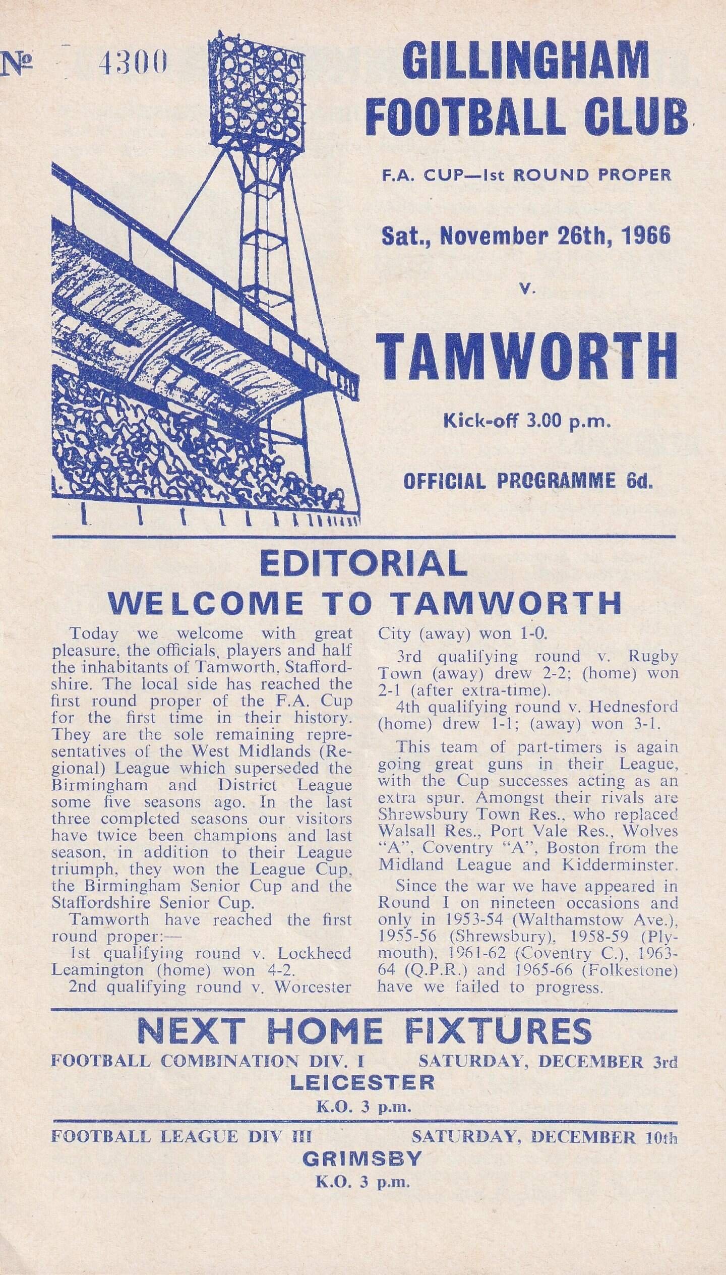 Match: Gillingham v Tamworth Competition: FA Cup 1st Round Date: 26-Nov-1966 Comments: Rating: 4 Condition: Very good Weight in grams: 40