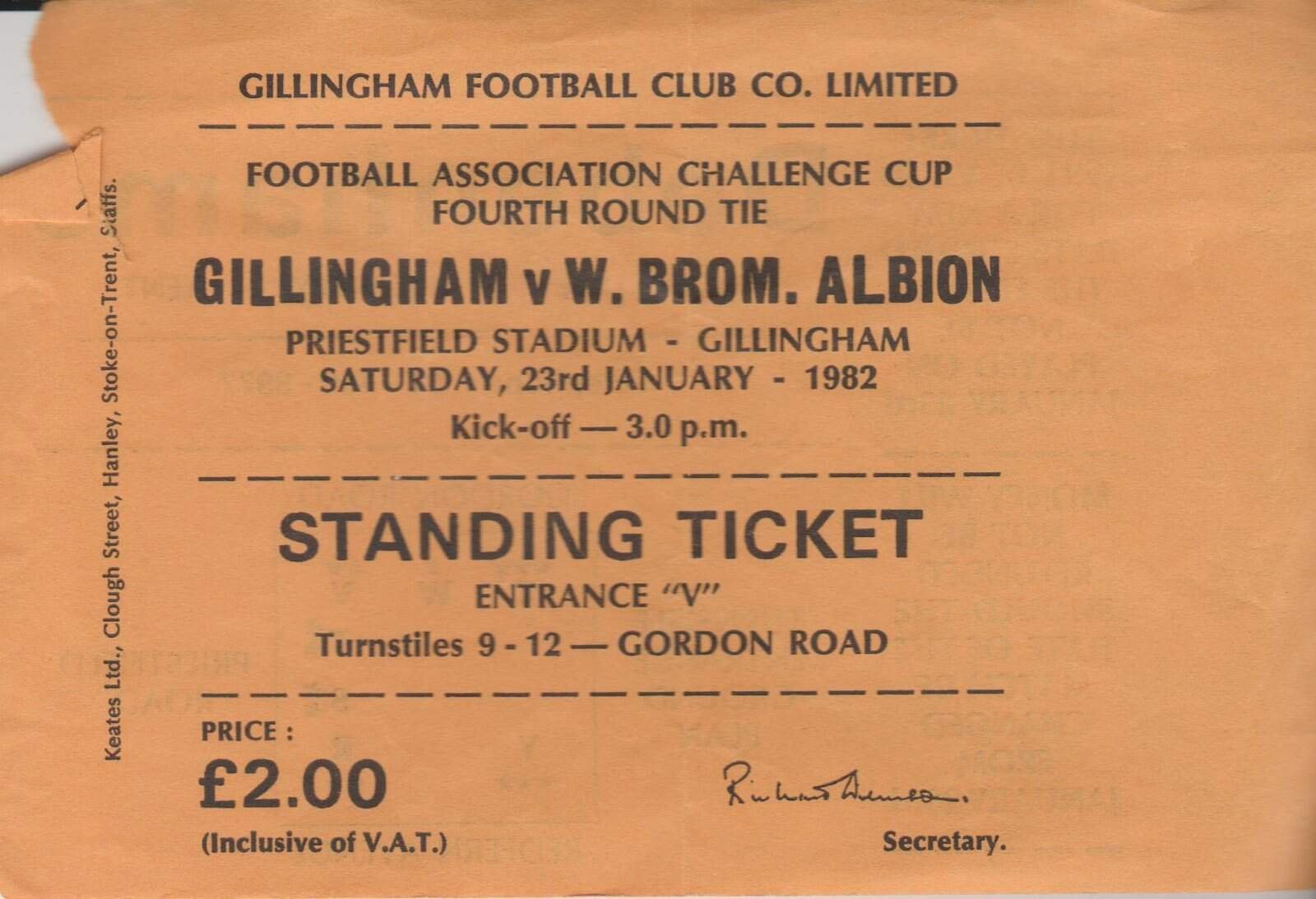 Match: Gillingham v West Bromwich Albion Competition: FA Cup 4th Round Date: 23-Jan-1982 Comments: Rating: 3 Condition: Tear on corner Weight in grams: 10