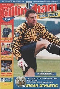 Match: Gillingham v Wigan Athletic Competition: League Division 2 Date: 07-11-1998 Comments: Rating: 4 Condition: Very good Weight in grams: 140
