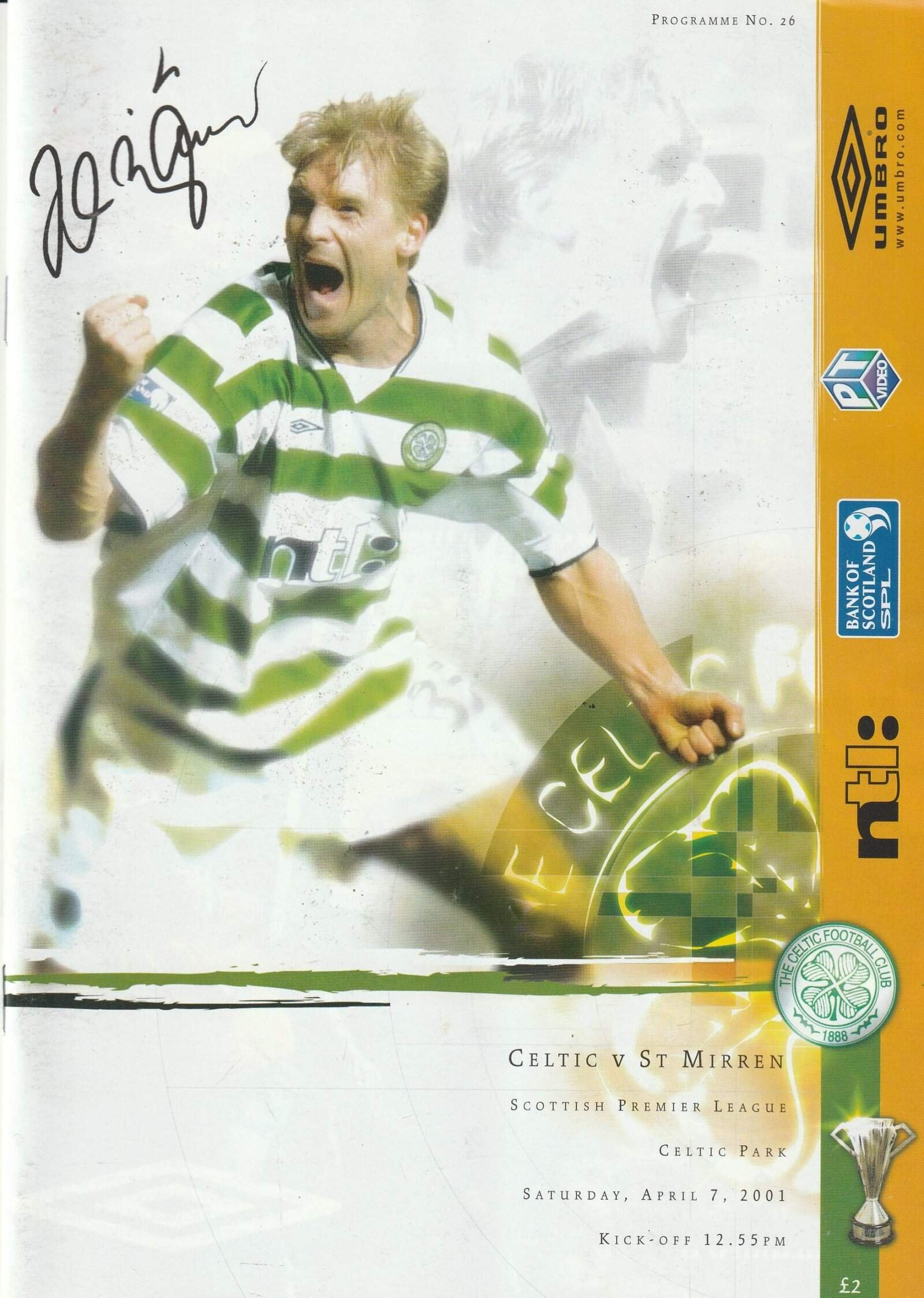 Match: Glasgow Celtic v St Mirren Competition: Scottish Premier League Date: 07-Apr-2001 Comments: Rating: 4 Condition: Very good Weight in grams: 140