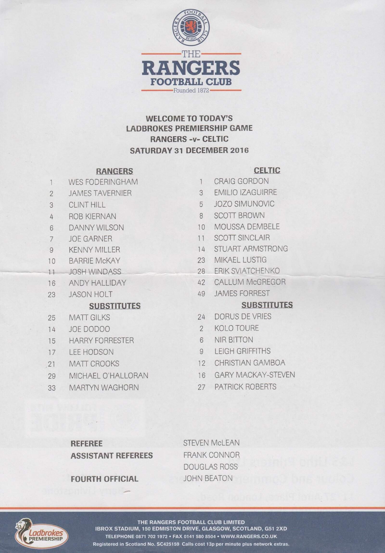 Glasgow Rangers v Glasgow Celtic 31-Dec-2016