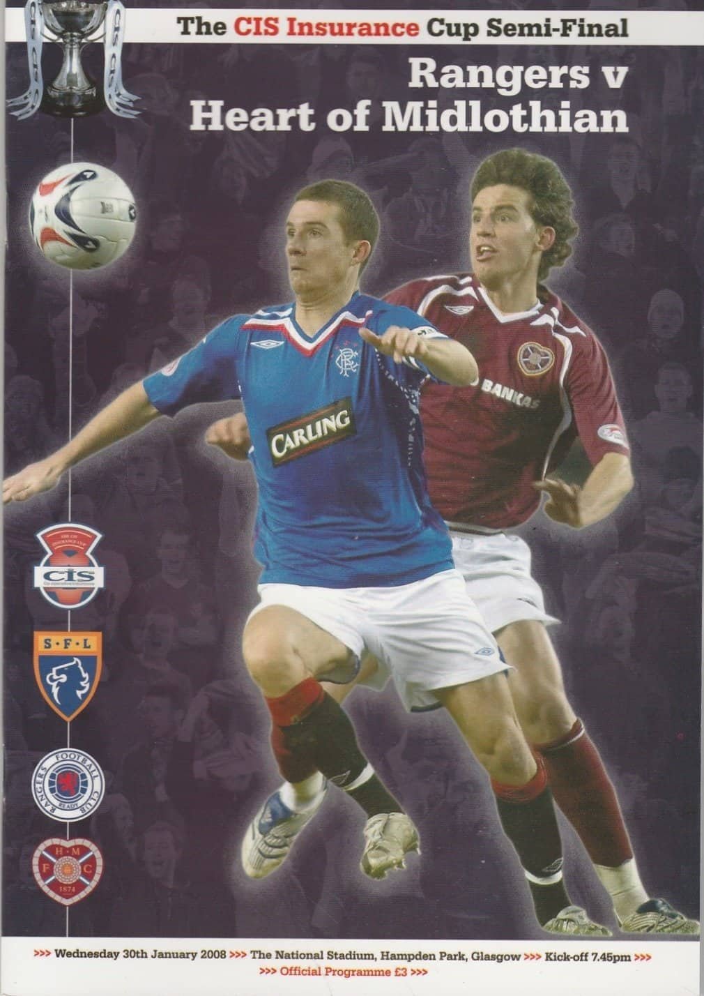Match: Glasgow Rangers v Heart of Midlothian Competition: CIS Insurance League Cup Semi Final Date: 30-Jan-2008 Comments: Rating: 4 Condition: Very good Weight in grams: 100