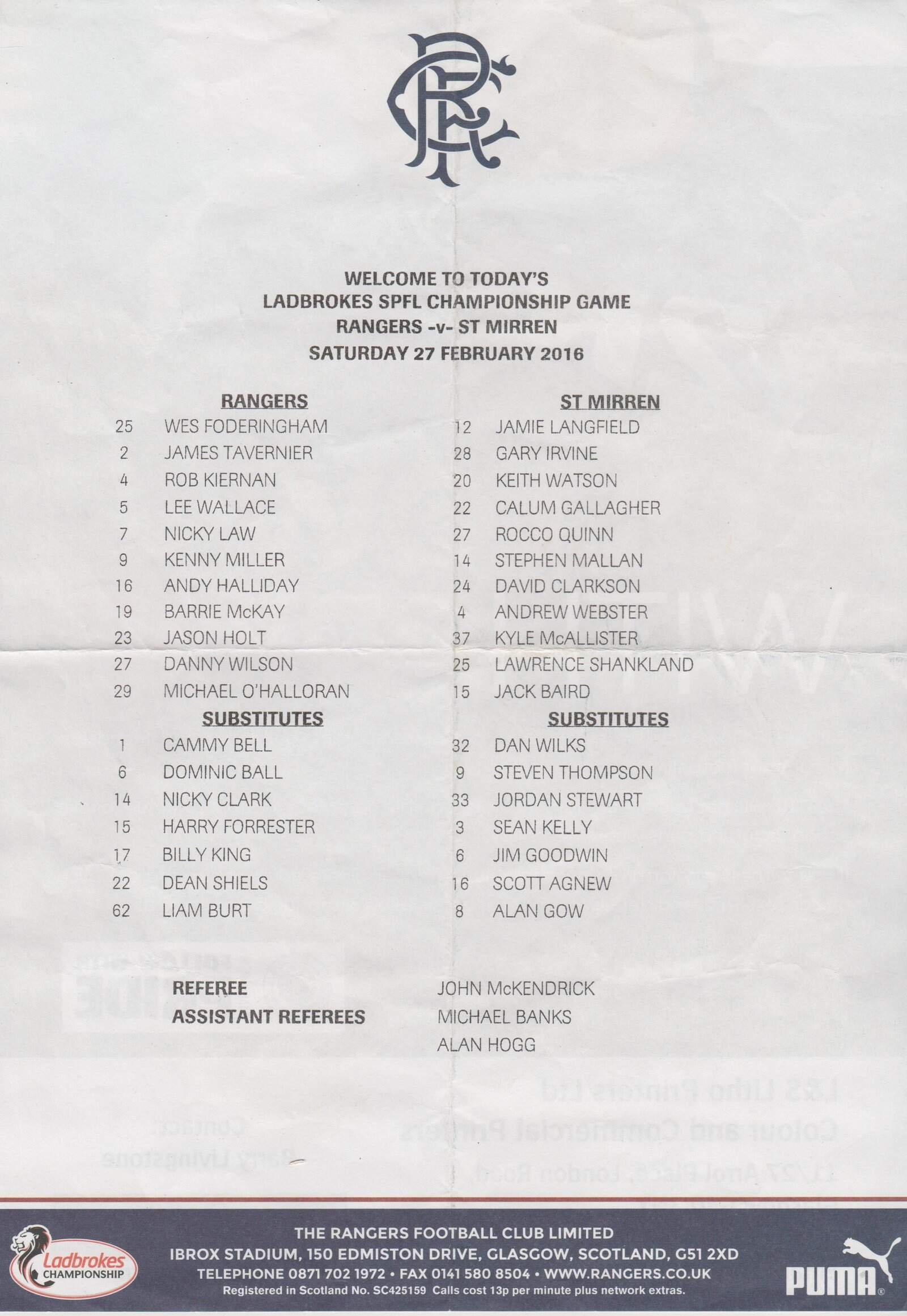 Match: Glasgow Rangers v St Mirren Competition: Scottish League Championship Date: 27-Feb-2016 Comments: Rating: 3 Condition: Folds Weight in grams: 10
