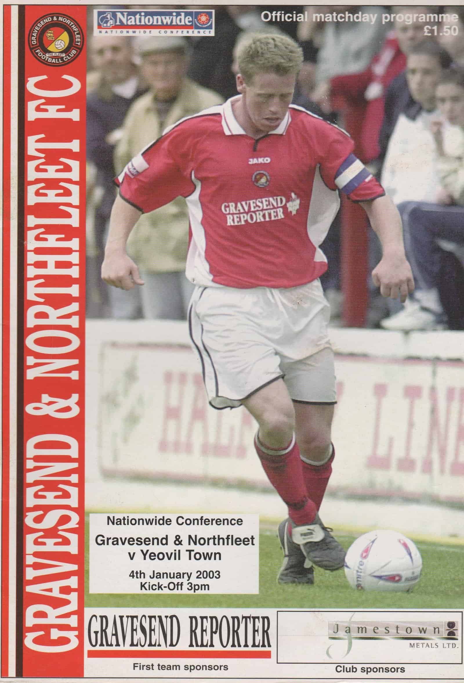 Match: Gravesend & Northfleet v Yeovil Town Competition: Nationwide Conference Date: 04-Jan-2003 Comments: Rating: 4 Condition: Very good Weight in grams: 160
