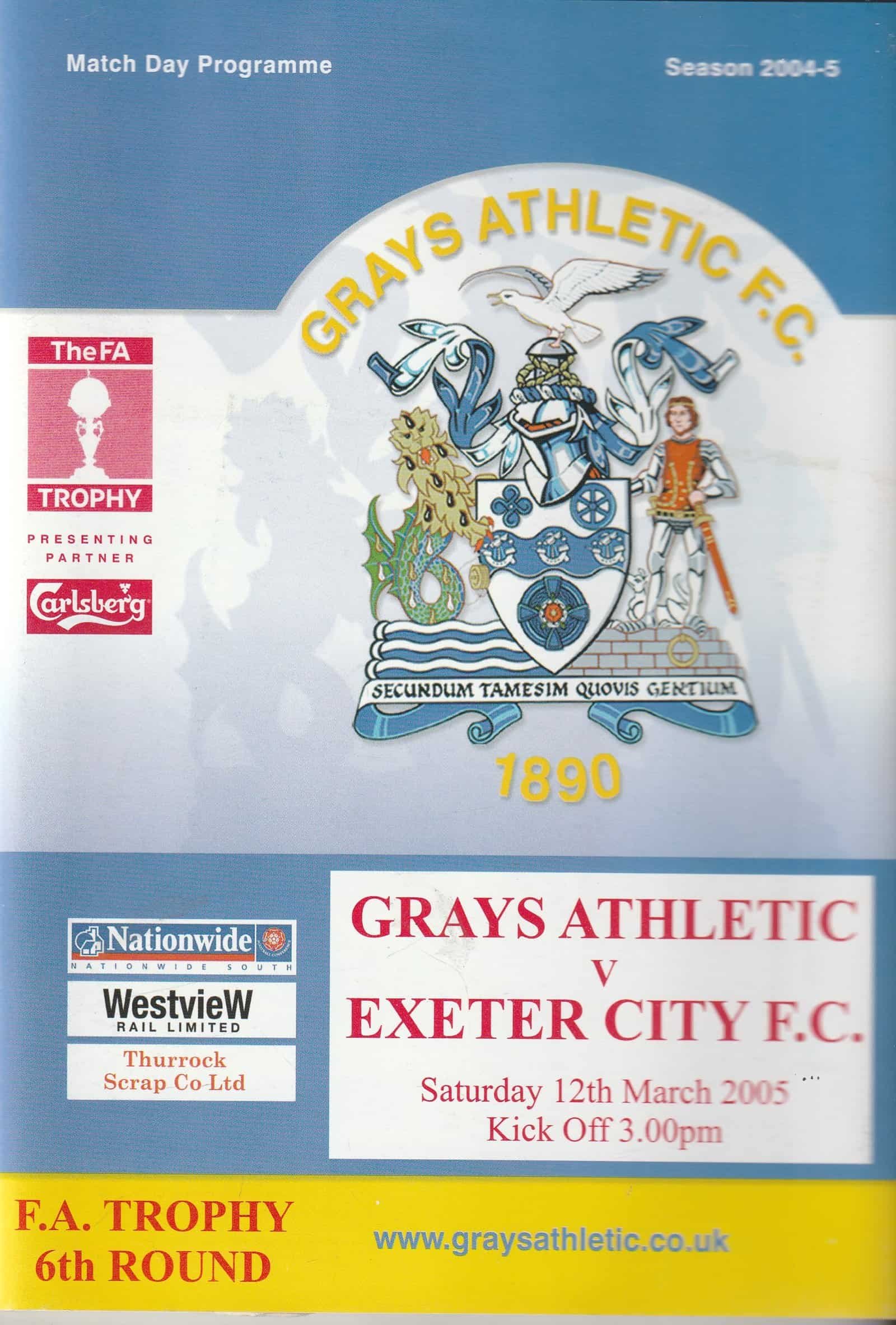 Match: Grays Athletic v Exeter City Competition: FA Trophy 6th Round Date: 12-Mar-2005 Comments: Includes press cuttings Rating: 4 Condition: Very good Weight in grams: 200