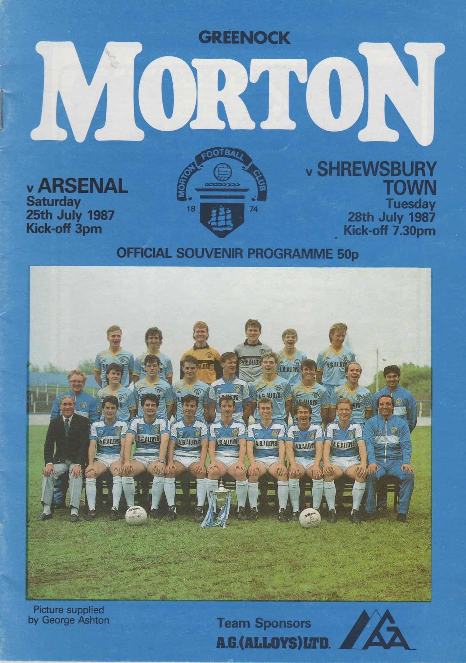 Match: Greenock Morton v Arsenal Competition: Friendly Date: 25-Jul-1987 Comments: Joint issue for Shrewsbury game Rating: 4 Condition: Good Weight in grams: 60