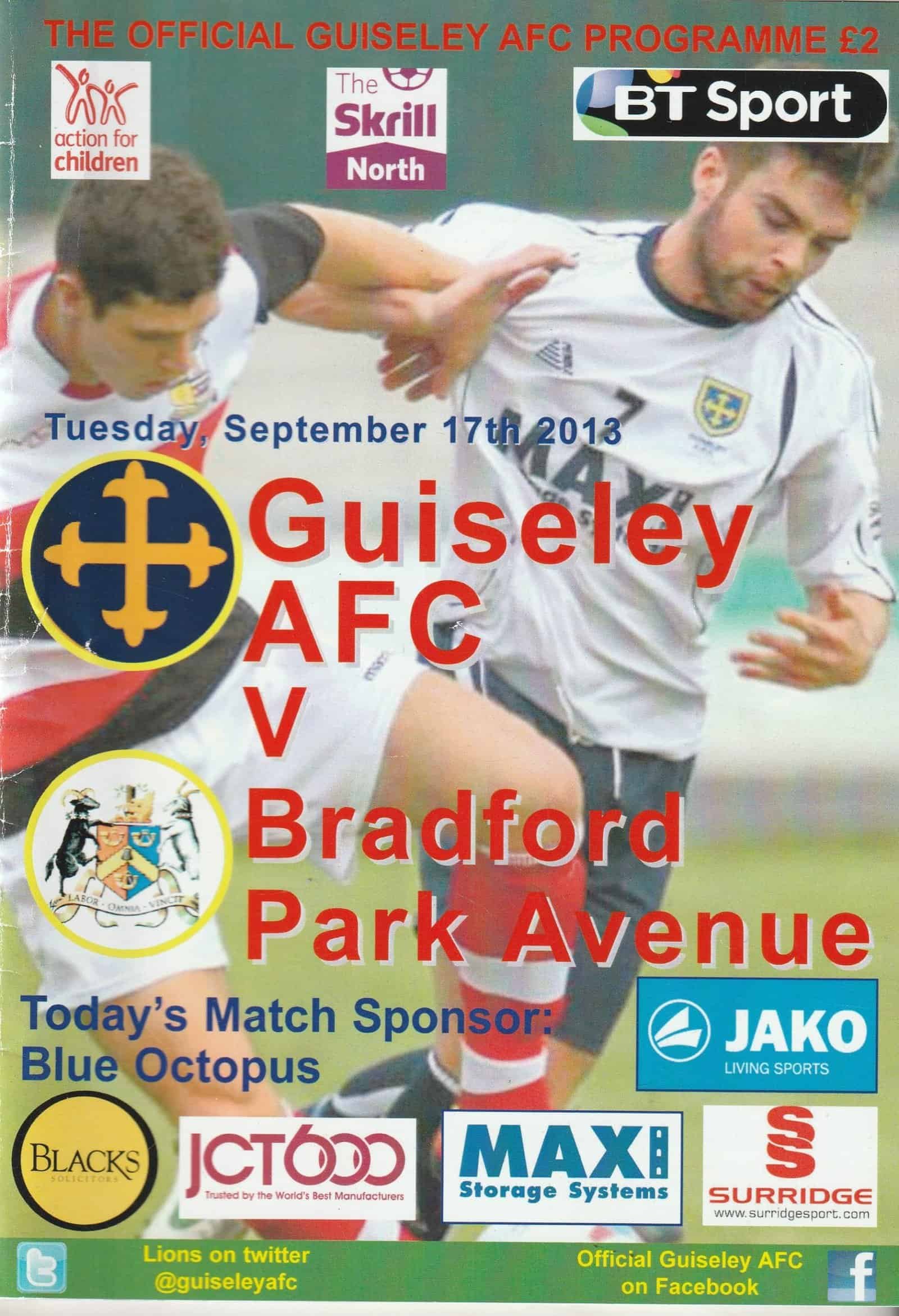 Match: Guiseley v Bradford Park Avenue Competition: Skrill North Date: 17-Sep-2013 Comments: Includes team sheet Rating: 4 Condition: Very good Weight in grams: 100