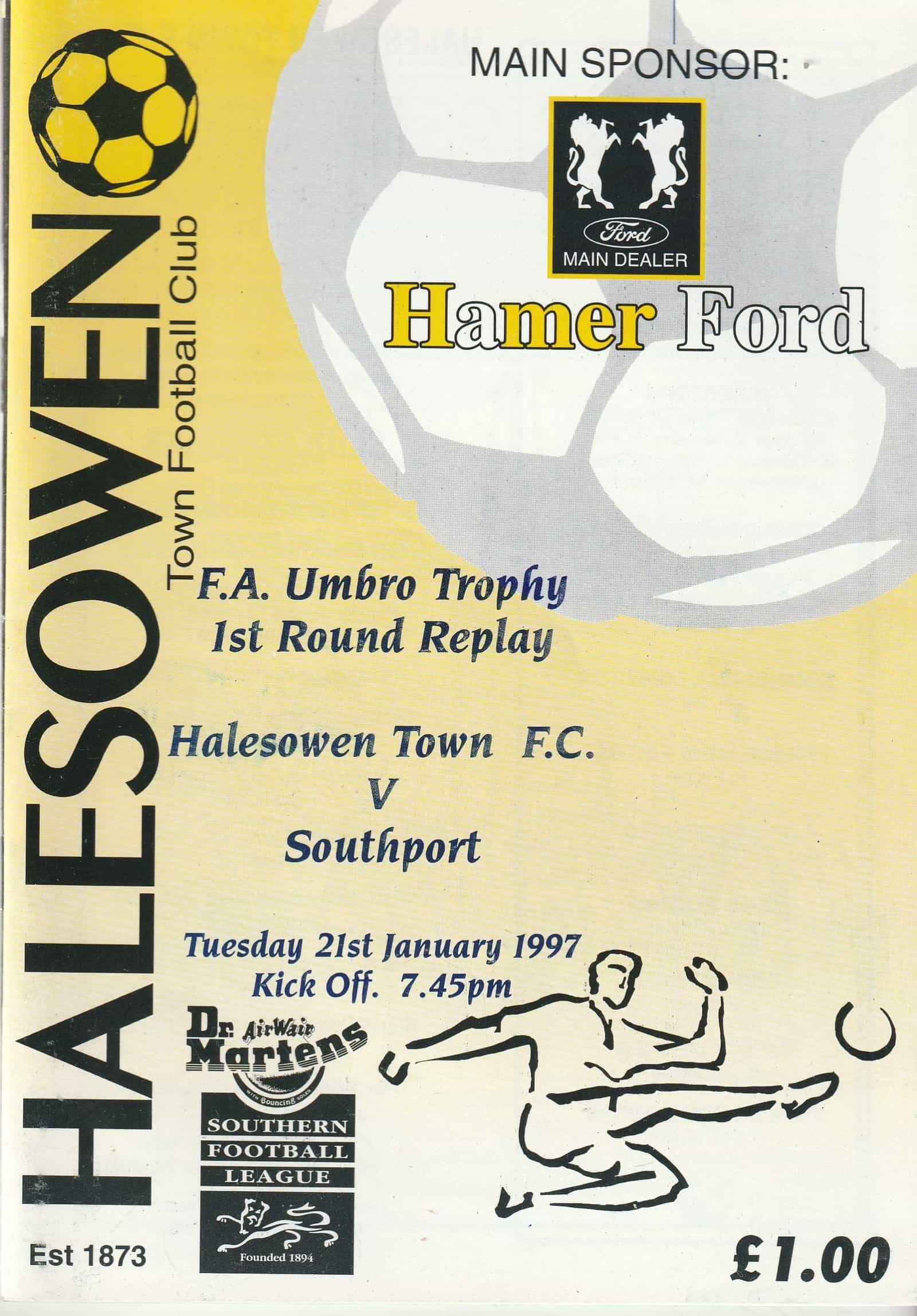 Match: Halesowen Town v Southport Competition: FA Trophy 1st Round Replay Date: 21-Jan-1997 Comments: Rating: 4 Condition: Very good Weight in grams: 120