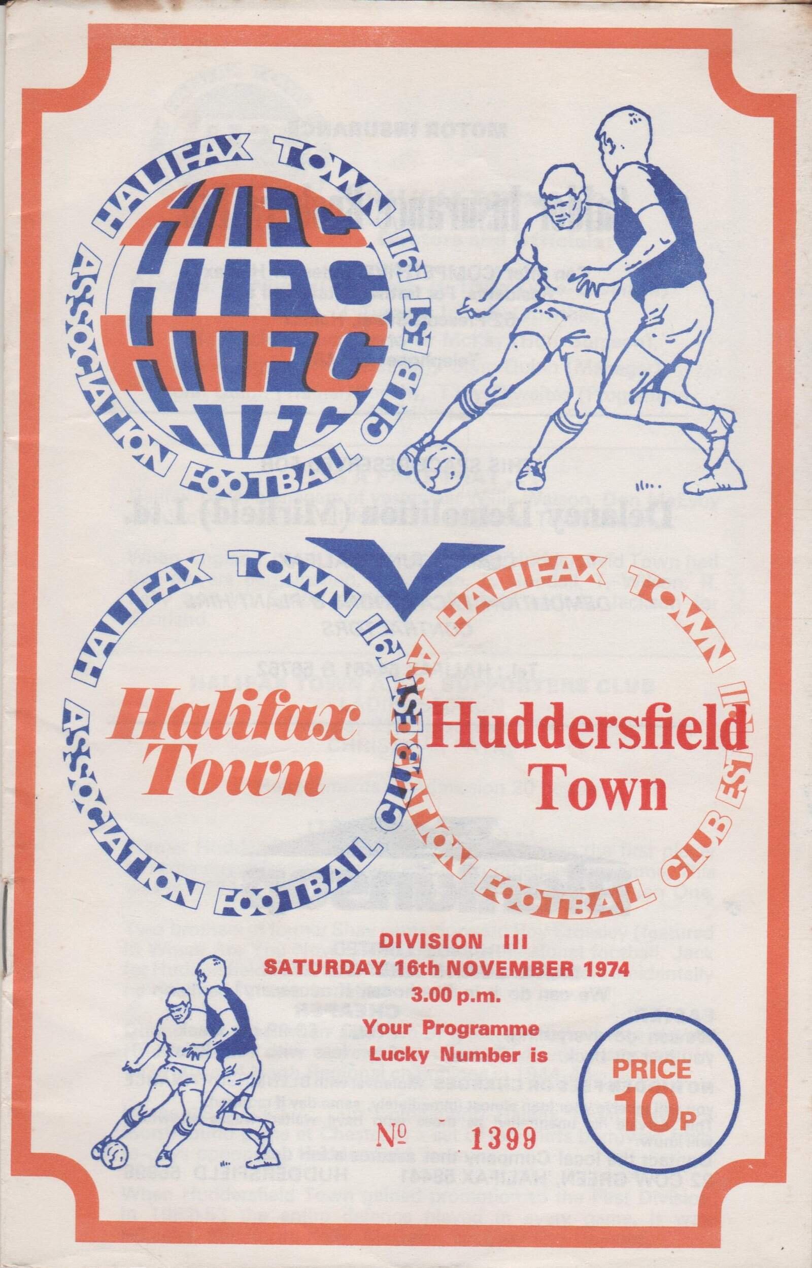 Match: Halifax Town v Huddersfield Town Competition: League Division 3 Date: 16-Nov-1974 Comments: Rating: 3 Condition: Marks on front/back cover, Fold Weight in grams: 60