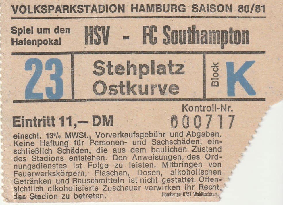Match: Hamburg SV v Southampton Competition: Friendly Date: 01-Aug-1980 Comments: Rating: 3 Condition: Counterfoil detached Weight in grams: 20