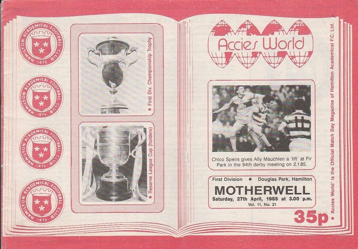 Match: Hamilton Academical v Motherwell Competition: Scottish League Division 1 Date: 18-Aug-1984 Comments: Rating: 4 Condition: Mark on back page, pen line neatly striked through six player names Weight in grams: 40