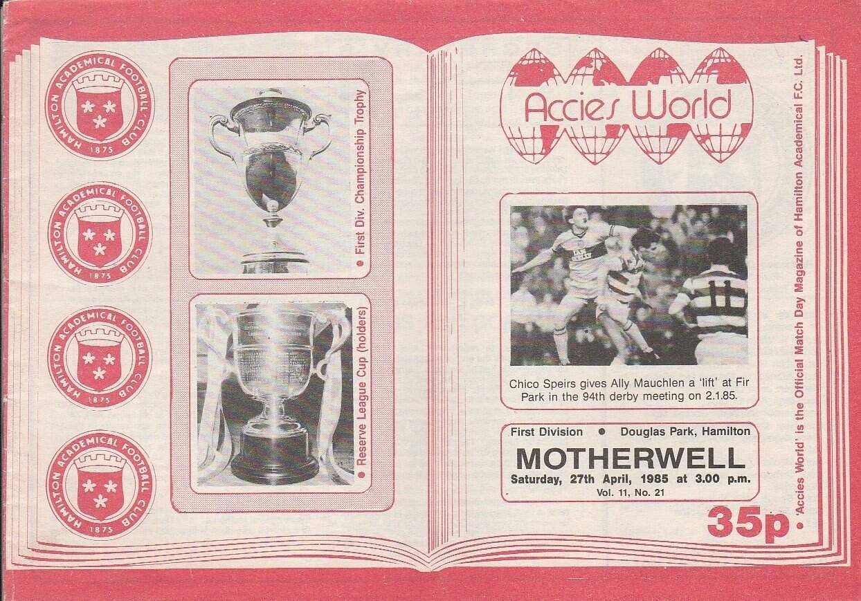 Match: Hamilton Academical v Motherwell Competition: Scottish League Division 1 Date: 27-Apr-1985 Comments: Rating: 3 Condition: Scores entered on fixtures section for review of 1937-38 season Weight in grams: 40