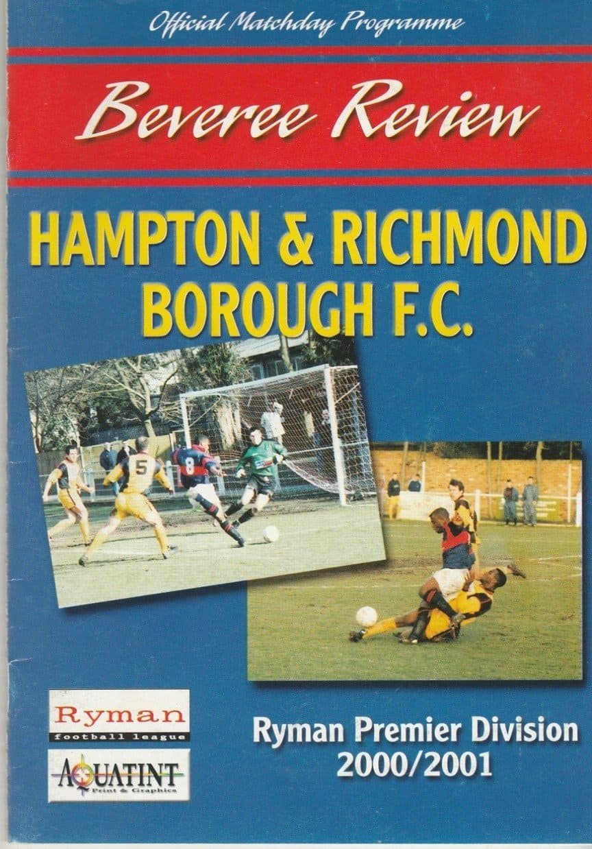 Match: Hampton & Richmond Borough v Billericay Town Competition: Ryman Premier League Date: 19-Aug-2000 Comments: Rating: 3 Condition: Team changes, Match report glued to two inside pages Weight in grams: 100