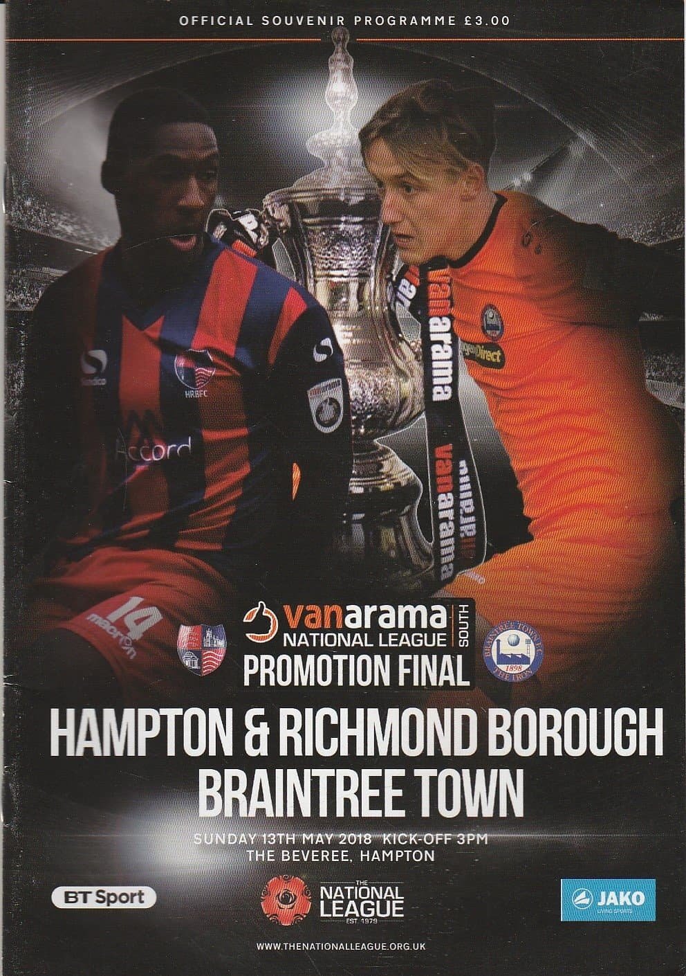 Match: Hampton & Richmond Borough v Braintree Town Competition: Vanarama National League South Promotion Final Date: 13-May-2018 Comments: Rating: 4 Condition: Very Good Weight in grams: 180