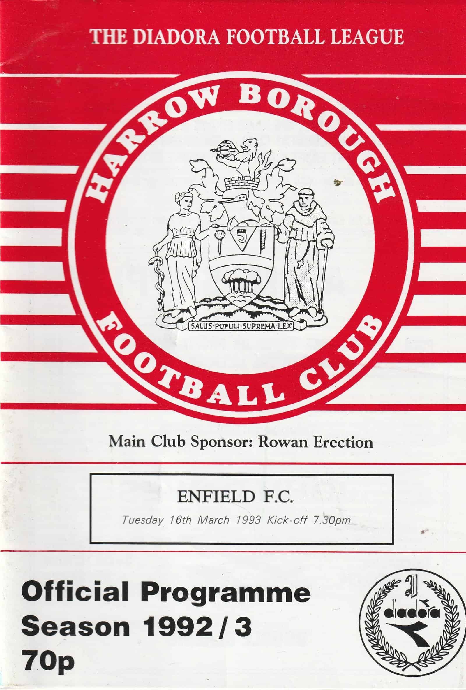 Match: Harrow Borough v Enfield Competition: Diadora League Premier Division Date: 16-Mar-1993 Comments: Rating: 3 Condition: Team changes Weight in grams: 100
