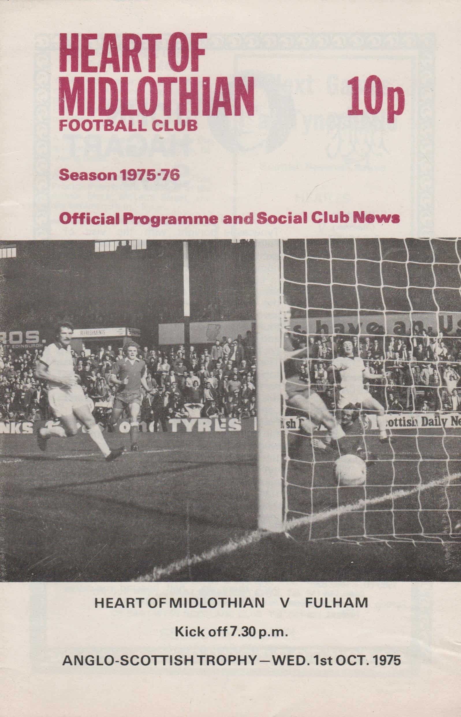 Match: Heart of Midlothian v Fulham Competition: Anglo Scottish Cup Date: 01-Oct-1975 Comments: Rating: 4 Condition: Very good Weight in grams: 60