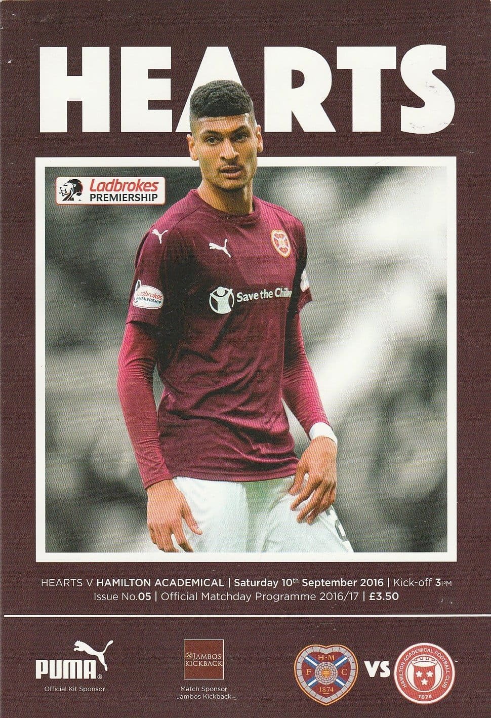 Match: Heart of Midlothian v Hamilton Academical Competition: Scottish Premier League Date: 10-Sep-2016 Comments: Rating: 4 Condition: Very good Weight in grams: 260