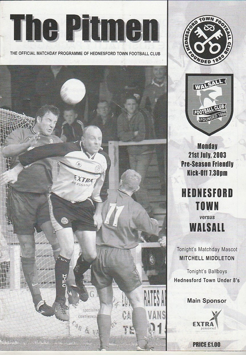 Match: Hednesford Town v Walsall Competition: Friendly Date: 30-Jul-2002 Comments: Rating: 4 Condition: Very good Weight in grams: 60