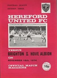Match: Hereford United v Brighton & Hove Albion Competition: League Division 3 Date: 16-11-1974 Comments: Rating: 4 Condition: Score on back Weight in grams: 60