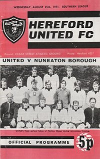 Match: Hereford United v Nuneaton Borough Competition: Southern League Premier Division Date: 25-08-1971 Comments: Last season prior to joining FL Rating: 4 Condition: Score on team line up page Weight in grams: 40