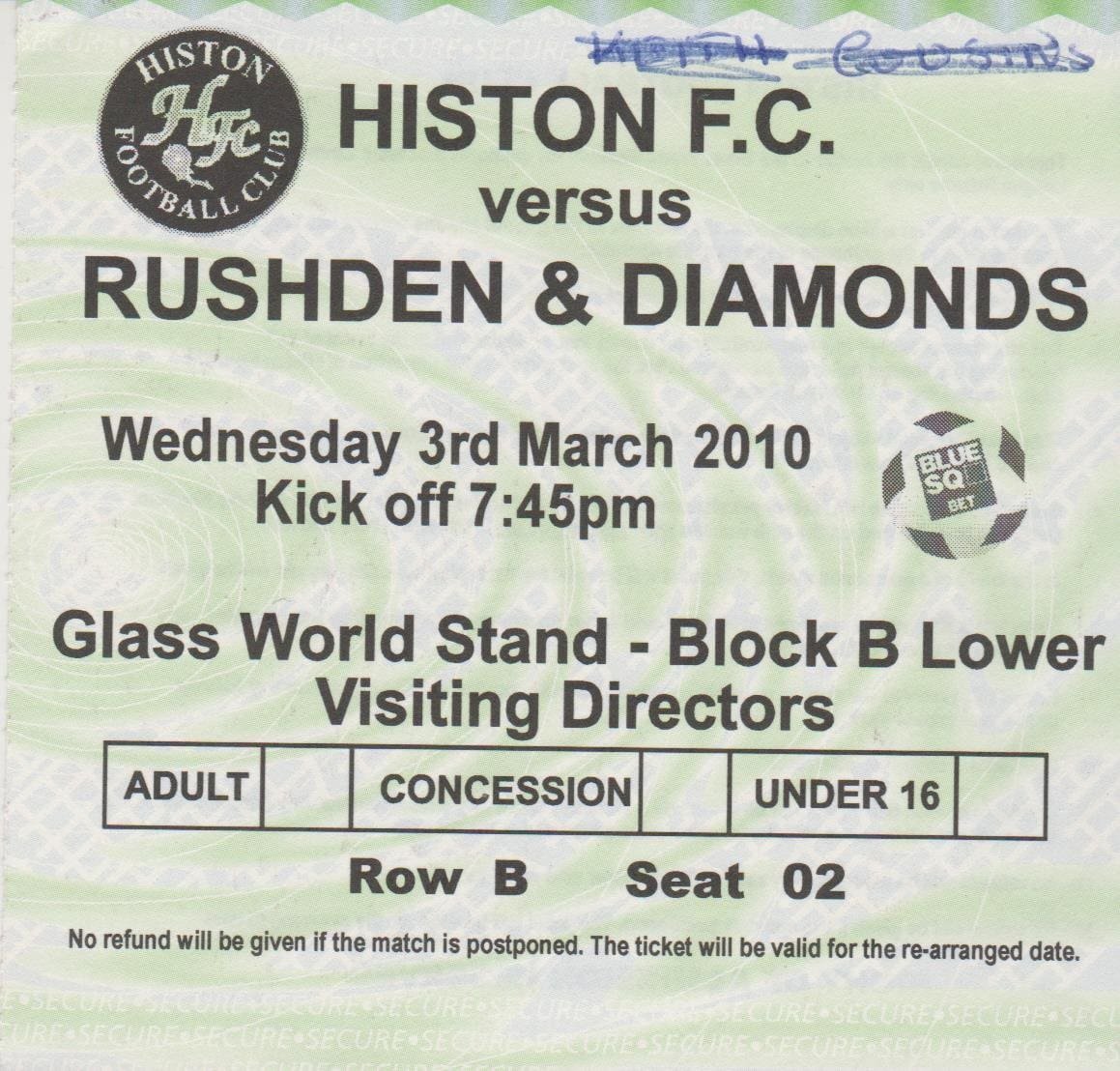 Match: Histon v Rushden & Diamonds Competition: Blue Square Premier Date: 03-Mar-2010 Comments: Rating: 3 Condition: Name on ticket Weight in grams: 10
