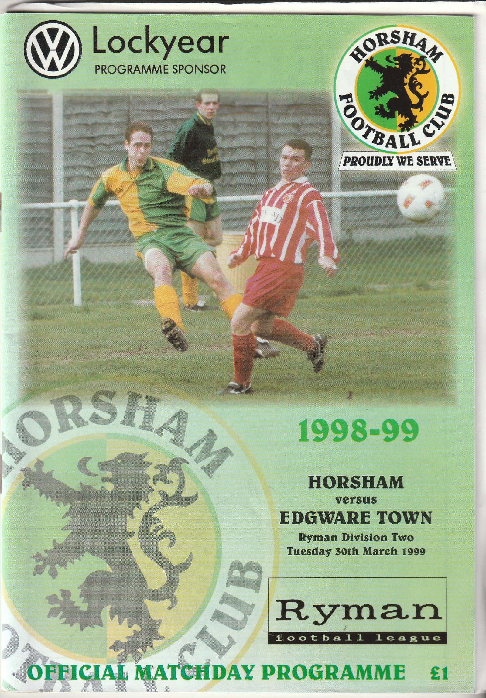 Match: Horsham v Edgware Town Competition: Ryman League Division 2 Date: 30-Mar-1999 Comments: Rating: 4 Condition: Very good Weight in grams: 140