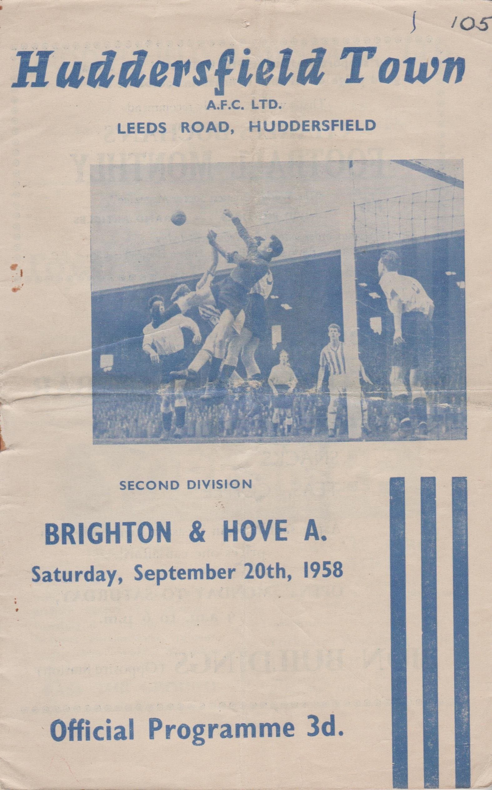Match: Huddersfield Town v Brighton & Hove Albion Competition: League Division 2 Date: 20-Sep-1958 Comments: Rating: 3 Condition: Fold, number on face, score inside, pin hole, slight staple rust Weight in grams: 60