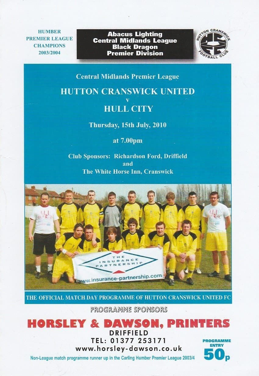 Match: Hutton Cranswick United v Hull City Competition: Friendly Date: 15-Jul-2010 Comments: 4 page issue Rating: 4 Condition: Very good Weight in grams: 40