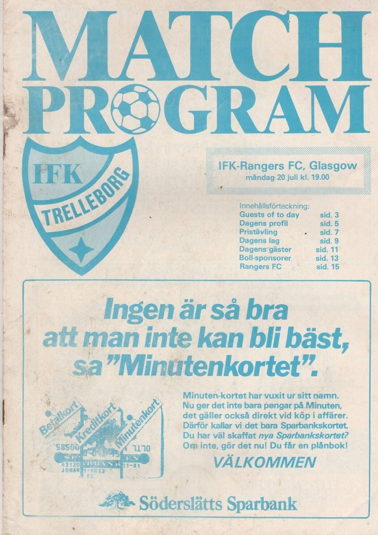 Match: IFK Trelleborg v Glasgow Rangers Competition: Friendly Date: 20-Jul-1981 Comments: Rating: 3 Condition: Scuff on cover near spine Weight in grams: 100