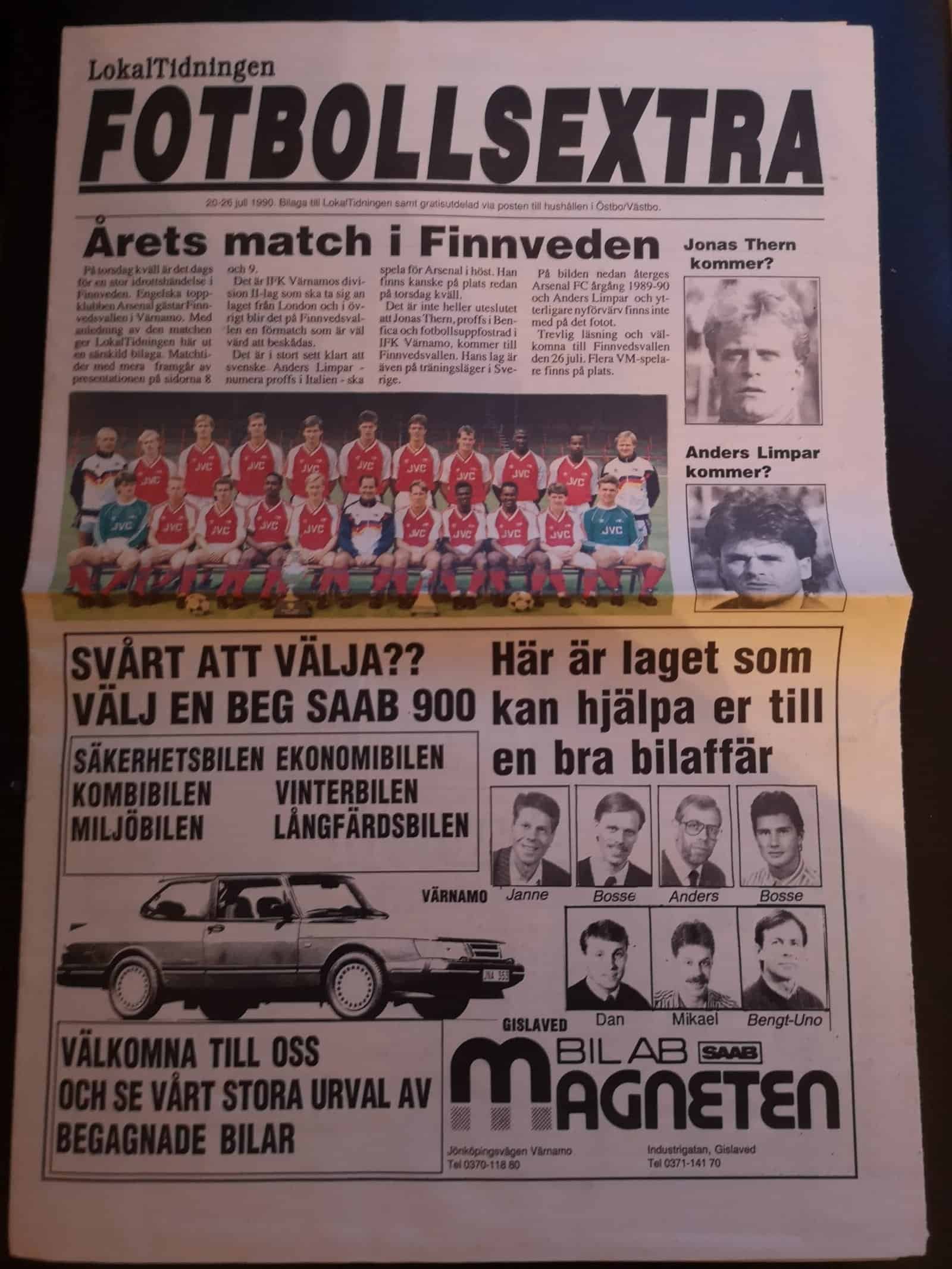 Match: IFK Värnamo v Arsenal Competition: Friendly Date: 20-Jul-1990 Comments: Newspaper size issue Rating: 4 Condition: Very good Weight in grams: 100