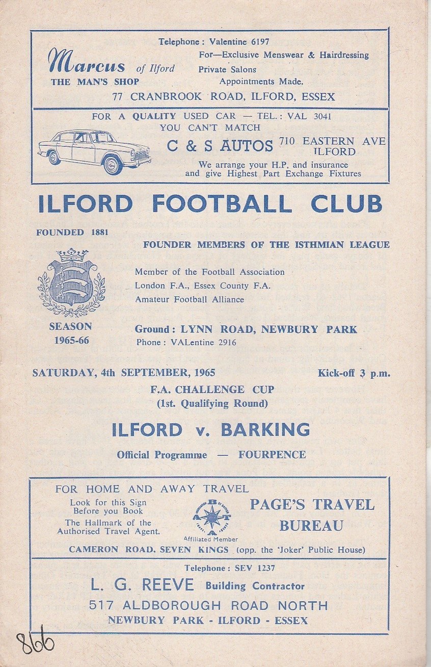 Match: Ilford v Barking Competition: FA Cup 1st Qualifying Round Date: 04-Sep-1965 Comments: Rating: 3 Condition: Number on face Weight in grams: 40