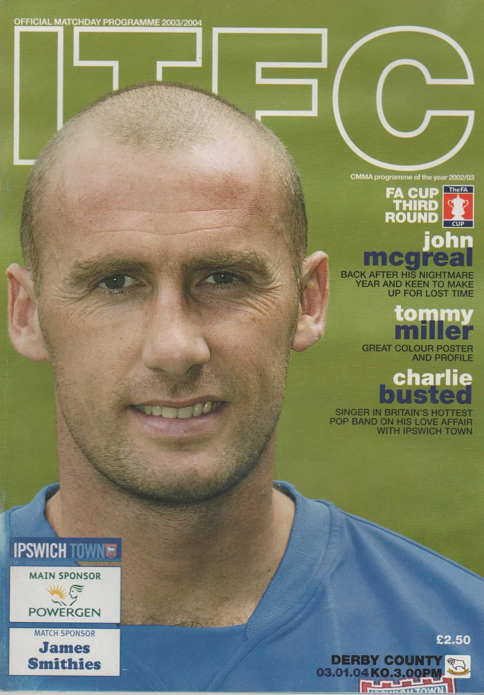 Match: Ipswich Town v Derby County Competition: FA Cup 3rd Round Date: 03-Jan-2004 Comments: Rating: 4 Condition: Very good Weight in grams: 220