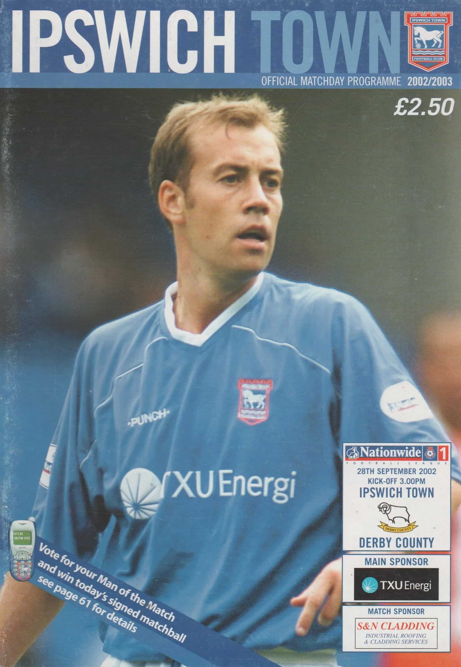 Match: Ipswich Town v Derby County Competition: League Division 1 Date: 28-Sep-2002 Comments: Rating: 4 Condition: Good Weight in grams: 160