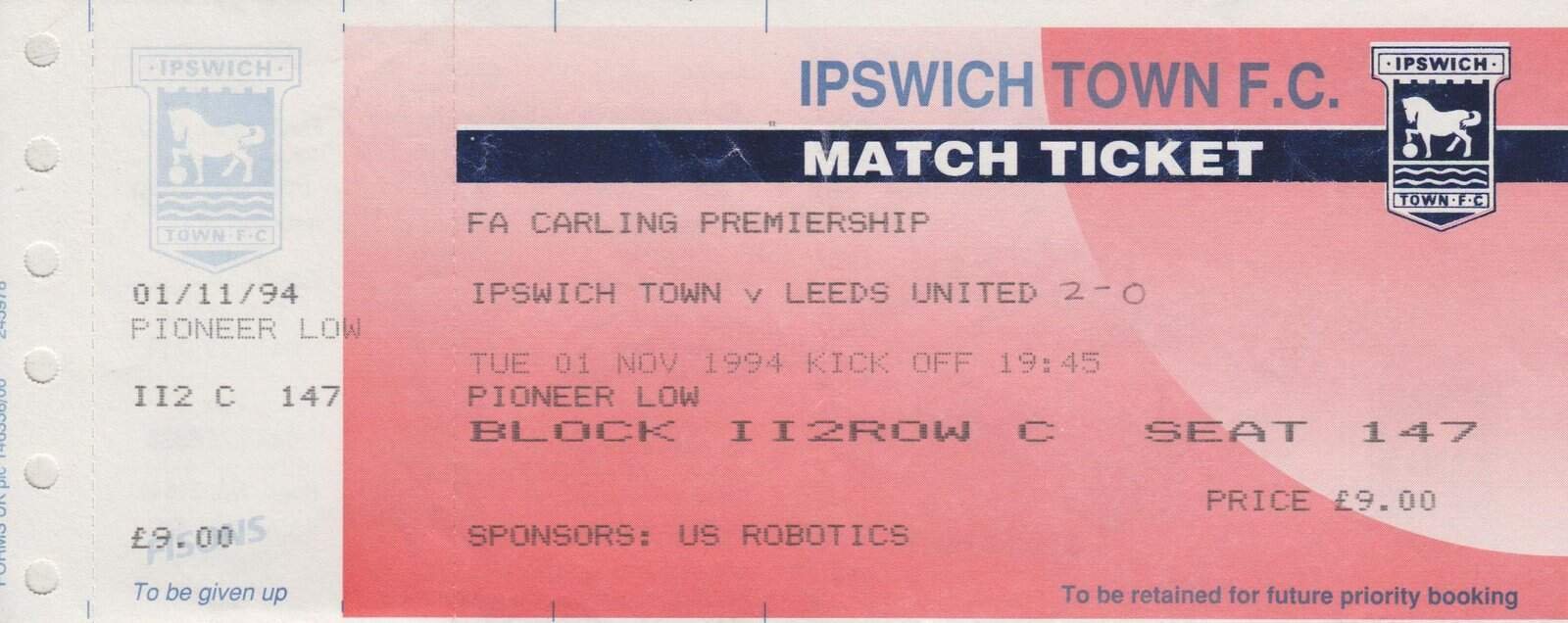 Match: Ipswich Town v Leeds United Competition: Carling Premiership Date: 01-11-1994 Comments: Rating: 3 Condition: Fold Weight in grams: 10