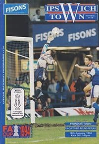 Match: Ipswich Town v Swindon Town Competition: FA Cup 3rd Round Replay Date: 18-01-1994 Comments: Rating: 5 Condition: Excellent Weight in grams: 80