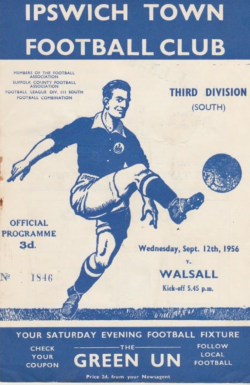 Match: Ipswich Town v Walsall Competition: League Division 3 South Date: 12-Sep-1956 Comments: Rating: 3 Condition: Rusty staple, slight corner turn on back page Weight in grams: 40