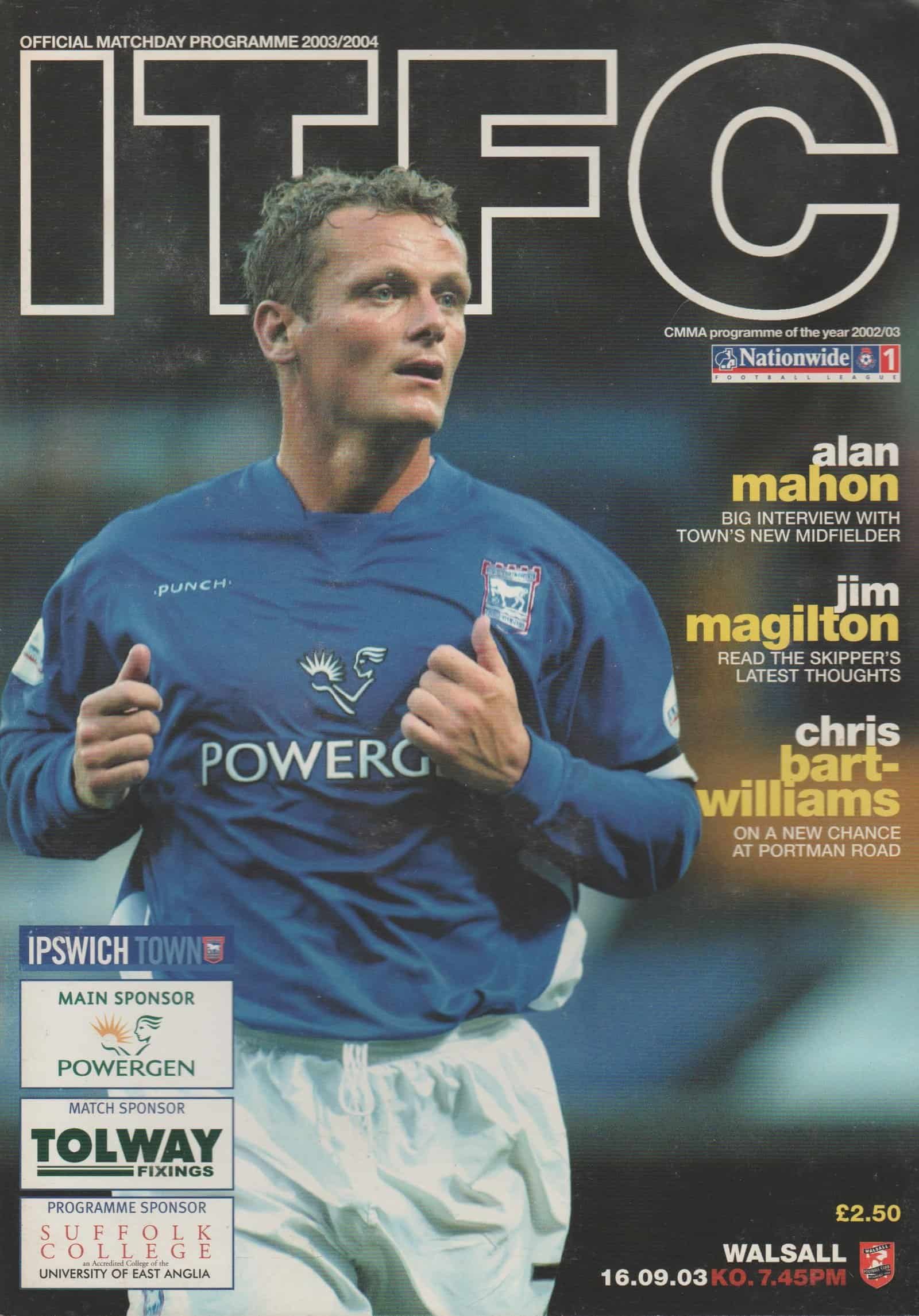 Match: Ipswich Town v Walsall Competition: Nationwide League Division 1 Date: 16-Sep-2003 Comments: Rating: 4 Condition: Very good Weight in grams: 180