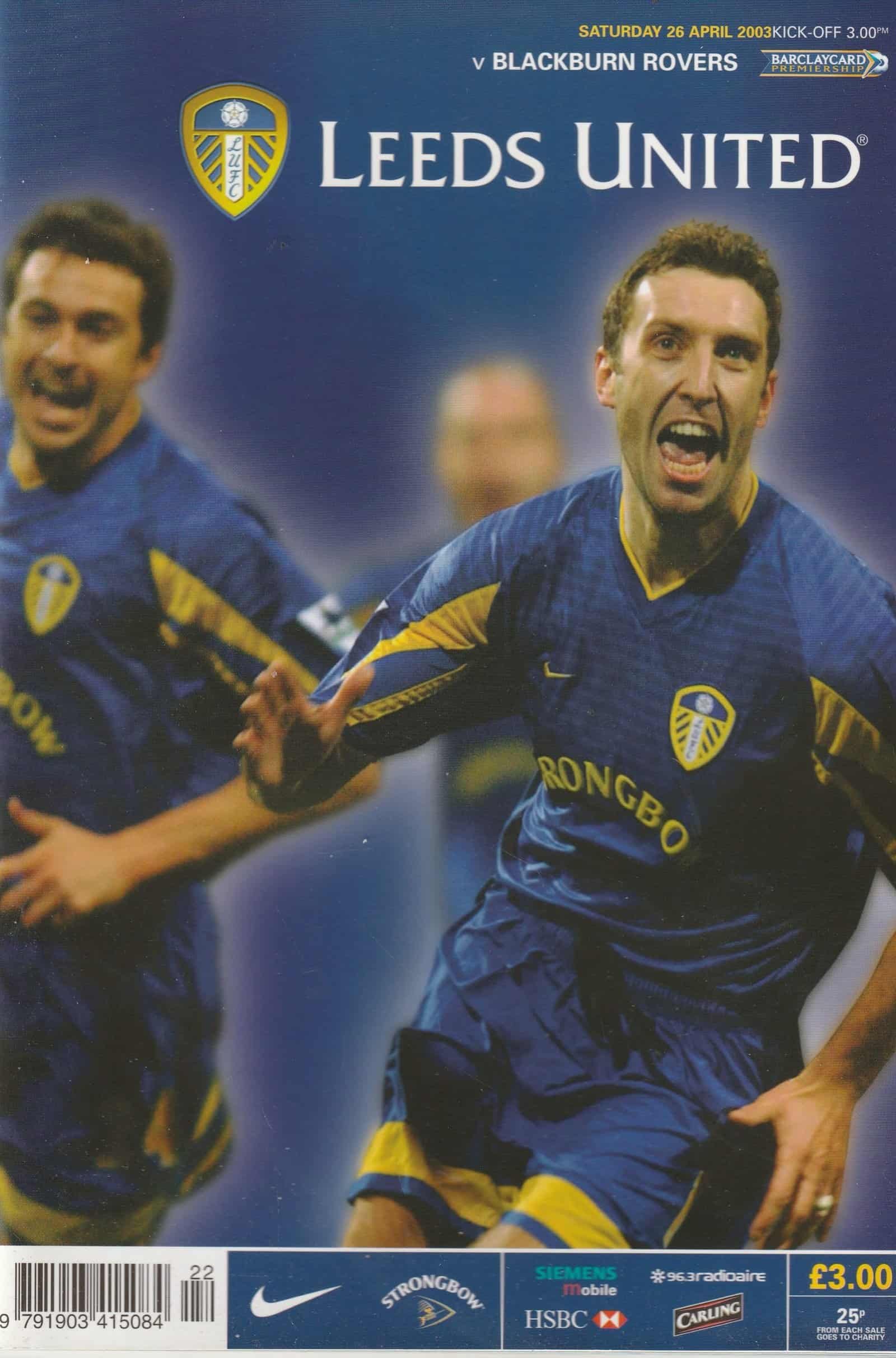 Match: Leeds United v Blackburn Rovers Competition: Premier League Date: 26-Apr-2003 Comments: Rating: 4 Condition: Very good Weight in grams: 260