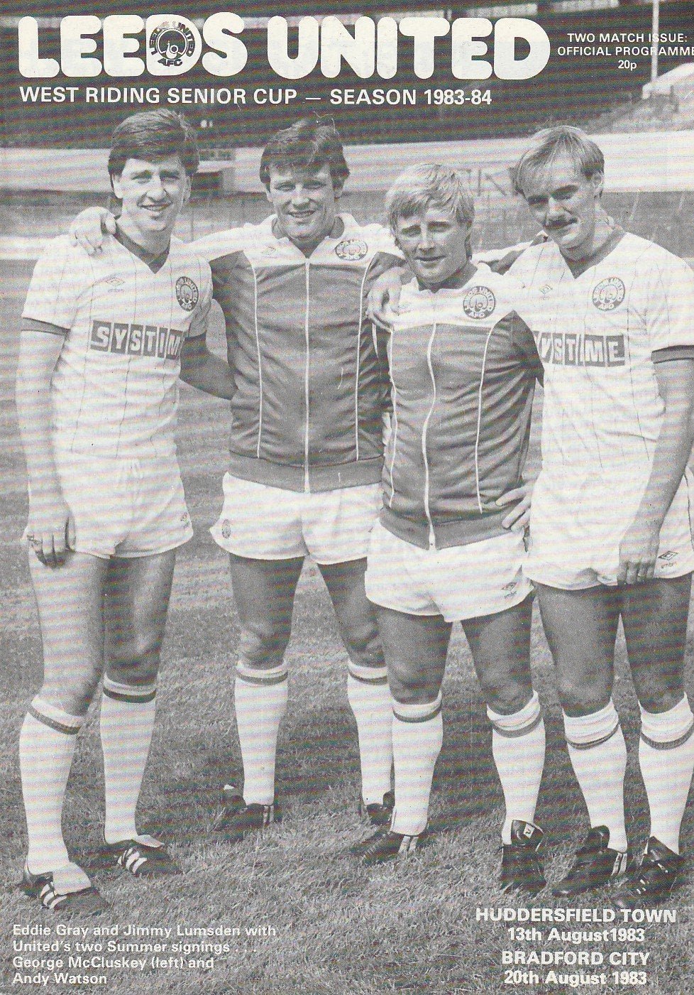 Match: Leeds United v Huddersfield Town Competition: West Riding County Senior Cup Date: 20-Aug-1983 Comments: Joint issue for Bradford City game Rating: 4 Condition: Very good Weight in grams: 40