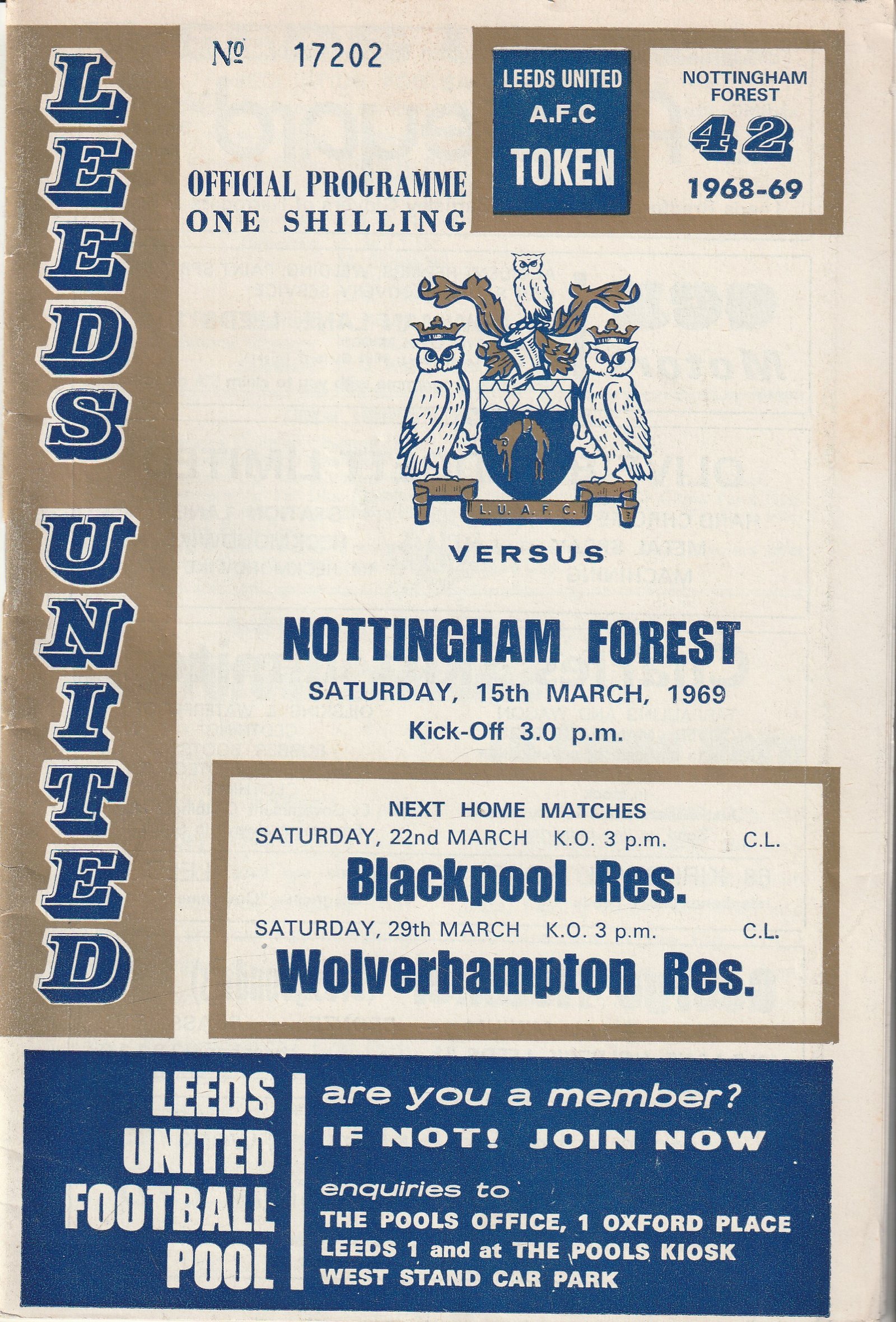 Match: Leeds United v Nottingham Forest Competition: League Division 1 Date: 15-Mar-1969 Comments: Postponed match issue Rating: 4 Condition: Very good Weight in grams: 40