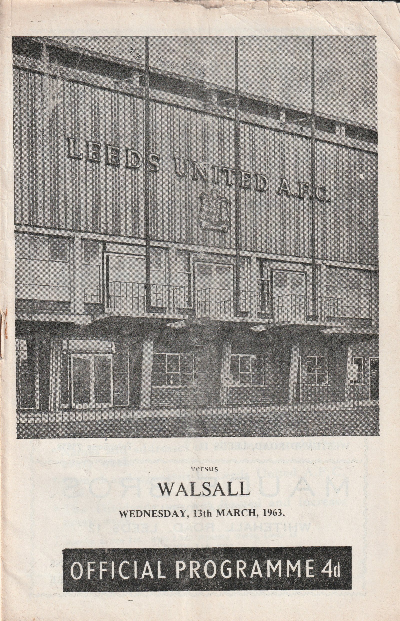 Match: Leeds United v Walsall Competition: League Division 2 Date: 13-Mar-1963 Comments: Rating: 3 Condition: Fold, corner folds and creasing, fraying along edges Weight in grams: 40